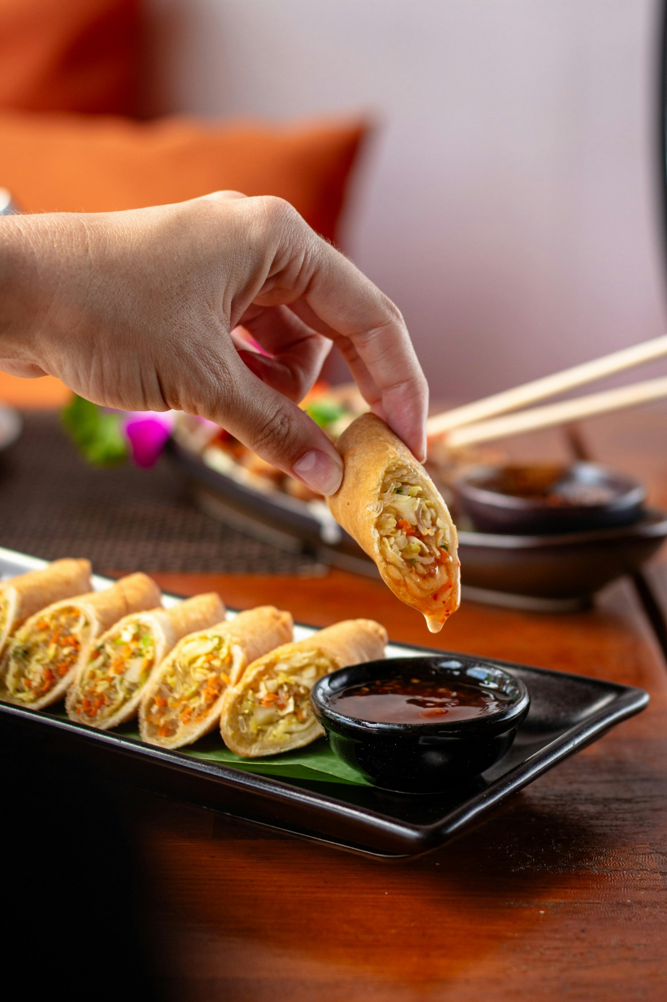 Delikatne sajgonki wypełnione świeżymi warzywami, podawane z sosem słodko-pikantnym.